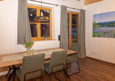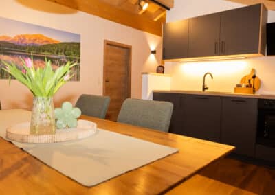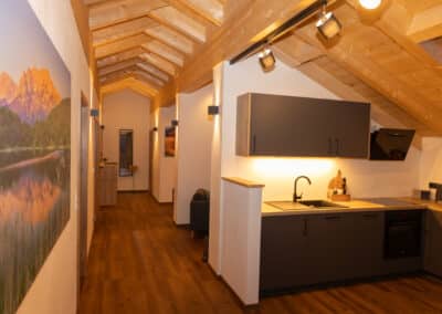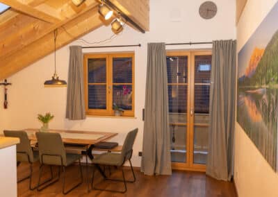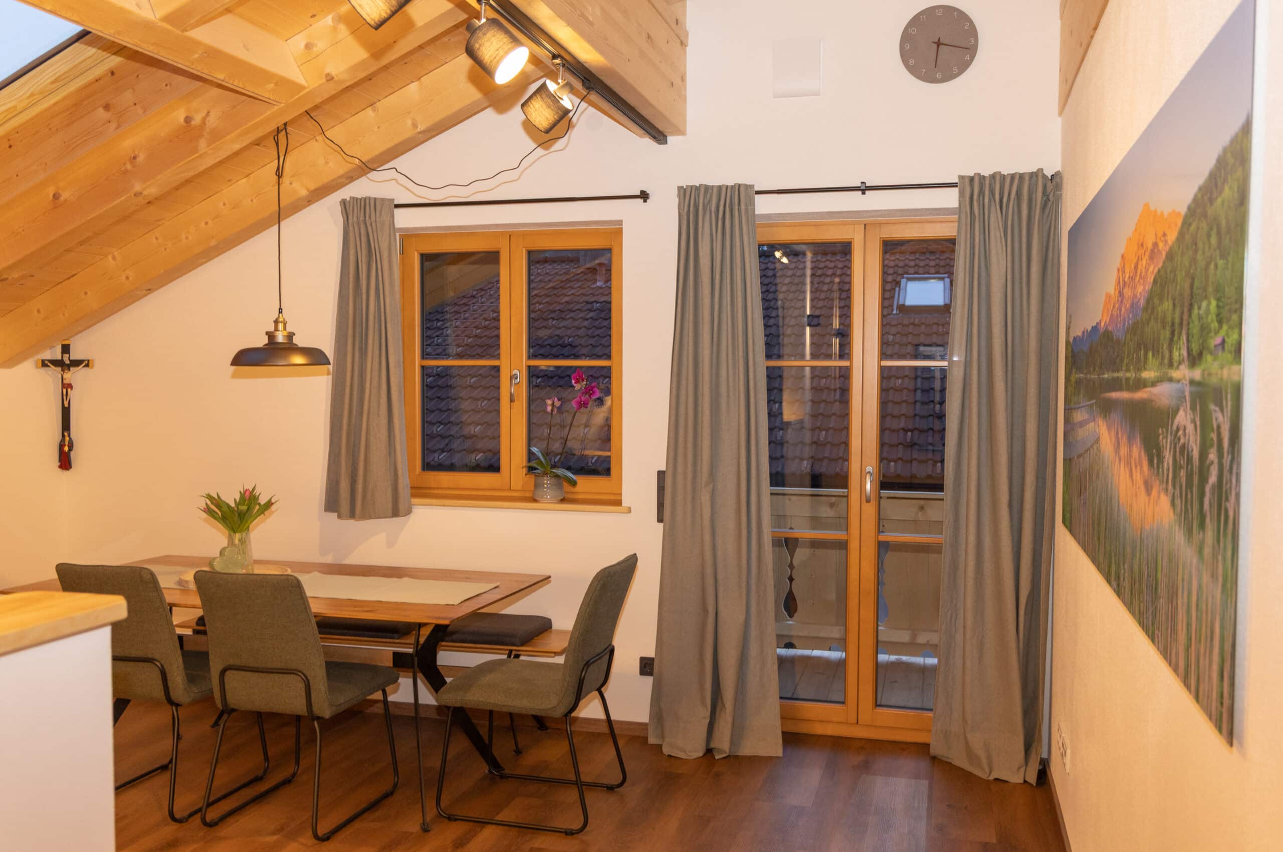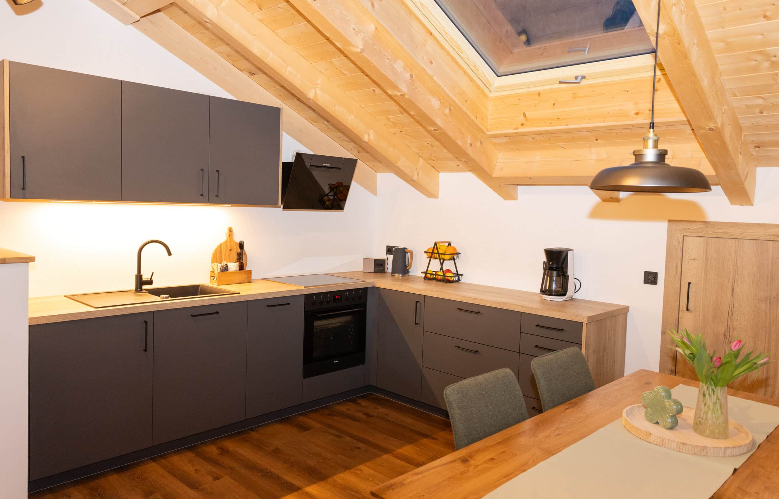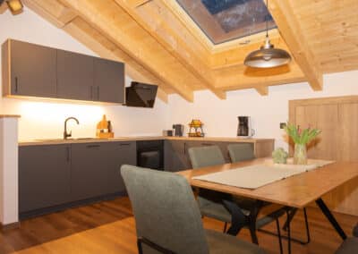 Die komfortable, komplett ausgestattete Küche mit großem Esstisch bietet einen einzigartigen Blick durch das Dachfenster direkt auf das beeindruckende Karwendel-Gebirge. So wird jede Mahlzeit zu einem besonderen Erlebnis.